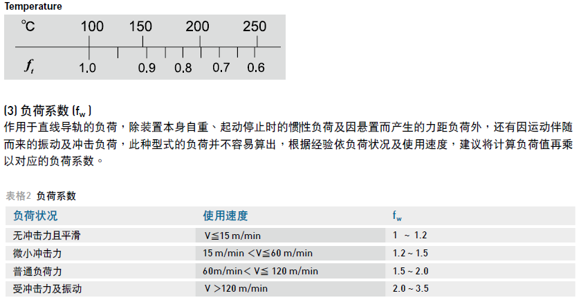 系統(tǒng)溫度會(huì)對(duì)直線導(dǎo)軌的材質(zhì)有影響,當(dāng)溫度高于100oC時(shí)直線導(dǎo)軌的額定負(fù)荷及使用壽命將會(huì)降低,此時(shí)動(dòng)、靜額定負(fù)荷為尺寸表列值再乘以對(duì)應(yīng)的溫度系數(shù)。由于有些配件是塑料材質(zhì)較不耐高溫,故建議使用溫度應(yīng)低于100oC。