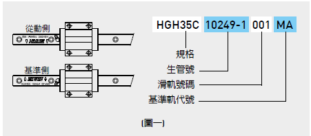 2. 確認基準軌與從動軌:當非互換型直線導軌配對使用時,需注意基準軌與從動軌之差異?;鶞受墏冗吇鶞拭婢容^從動軌高,可作為床臺安裝承靠面?;鶞受壣嫌锌躺螹A之記號。而且,雙軌配對使用時,基準軌編號為奇數,而從動軌之導軌編號為偶數,安裝時請依照符號的指示,按順序進行安裝(例如:001與002配對、003與004配對…),如圖一所示。如為多軌安裝,請以此類推。