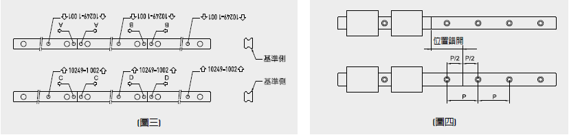 4. 導軌接牙件:導軌接牙安裝時必須依照導軌上標示順序安裝,以確保直線導軌精度。接牙標幟在接牙端的上表面,請將相同接牙標幟的兩端接在一起,如圖三所示。且建議配對之導軌接牙位置最好能錯開,以避免床臺至接牙處因不同導軌差異而造成精度不良,如圖四所示。