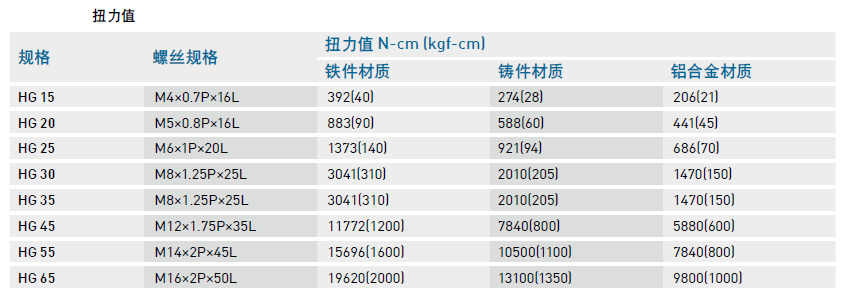 安裝導軌時是否鎖緊貼平基準面影響直線導軌精度甚劇,因此為達到每顆螺絲都能鎖緊的目的,建議使用下列扭力值鎖裝配螺絲。
