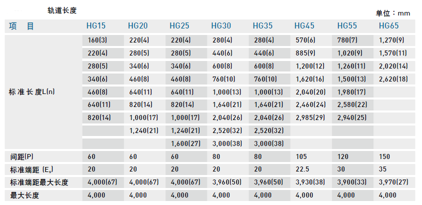 單支導軌標準長度及最大長度