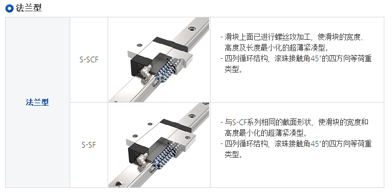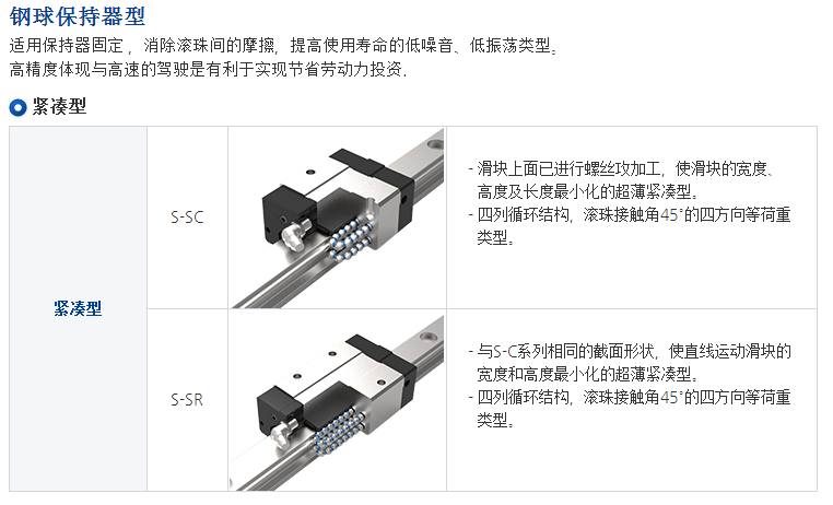 S系列使用四列鋼珠承受負(fù)荷設(shè)計,使其具備高剛性、高負(fù)荷的特性,同時具備四方向等負(fù)載特色、及自動調(diào)心的功能, 可吸收安裝面的裝配誤差,得到高精度的訴求。 加上降低組合高度及縮短滑塊長度,非常適合高速自動化產(chǎn)業(yè)機械及空間要求的小型設(shè)備使用。